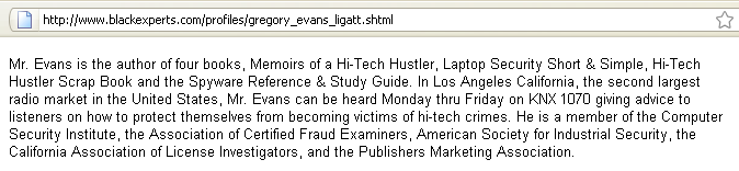 Courtesy of SJ, it appears that Gregory D. Evans' claims of being a Certified Fraud Examiner (CFE) are false. Currently, Evans has made this claim on his LinkedIn profile, Black Experts Profile, LIGATT Security About Page and Amazon Author Bio. Screenshots are included below in case any of these sites are edited shortly after the release of this article. (Click image to enlarge)