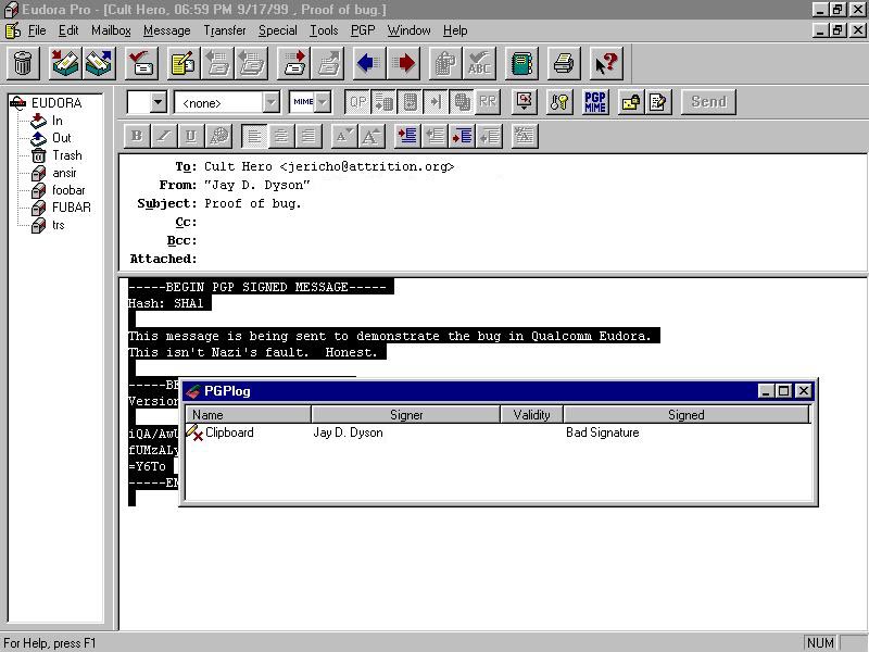 original generation of the PGP signature, the message now has a "Bad Signature."